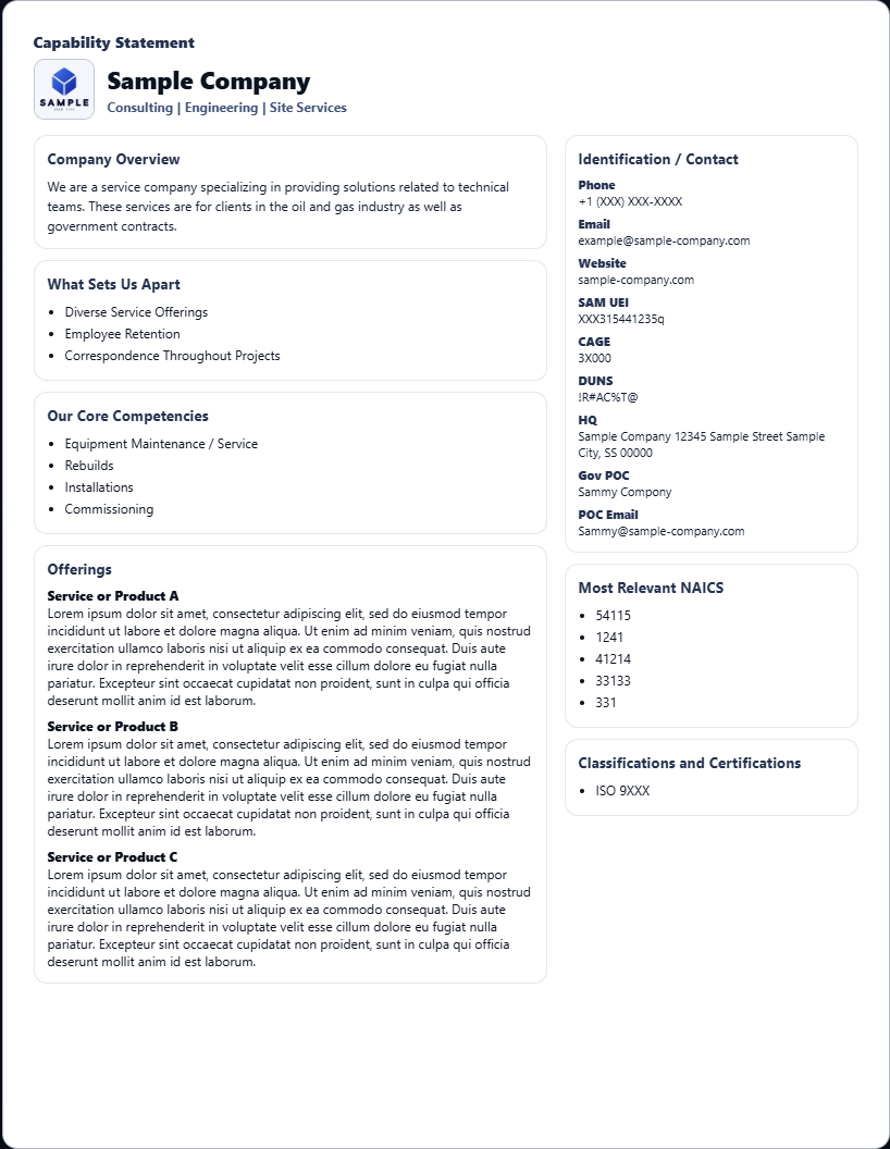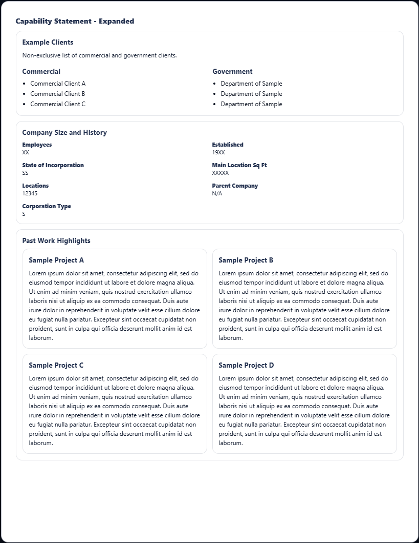 These are real capability statement examples generated using a structured input format. Each example shows a clear, one-page layout designed for quick review by procurement teams. For best results, create your own using the builder and export a clean PDF.